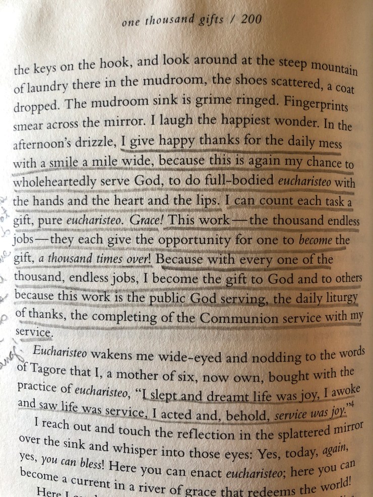 The friend who gifted me with the book did not kid when she said it was a hard read. The entire book is about finding a heart of gratitude. God is the giver of all things. Sometimes those things are good. Sometimes they’re bad. But all of them are working toward our good. Not material blessing. Not visiting every exciting locale in the world. Not accomplishing great things by the world’s standards. Those things might come, but it’s about becoming more full of him. It’s about realizing that life isn’t an emergency. That there are miracles in every. Single. Moment. She goes on for pages about the beauty of a soap bubble. And she begins to write down all of these little beautiful moments. And in doing so she slows down. Can really see the beauty and goodness of what’s around her. Even in the hard things. And in finding all these sources of beauty and blessing, she finds peace. And in finding peace, she finds joy. And in finding joy she wants to pour that out on others in service. And in doing that she blesses and is blessed all the more. How. Beautiful.
